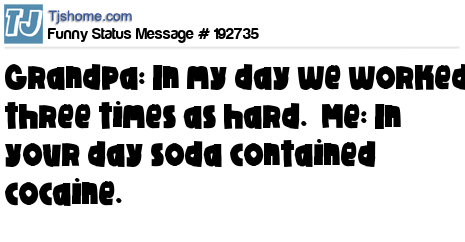X says Grandpa: In my day we worked three times as hard. Me: In your day soda contained cocaine.