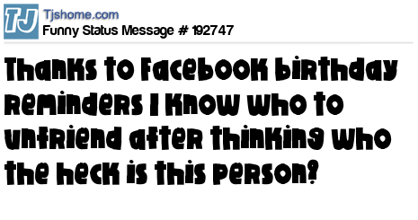 - # 194130 Facebook birthday reminders are great as they help me realize I have absolutely no idea who this person is to unfriend.
