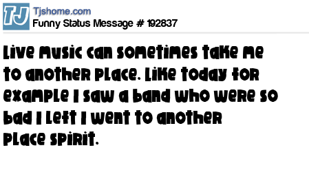 - # 192839 Live music can sometimes take me to another place. Like today for example I saw a band who were so bad I left I went to another place.