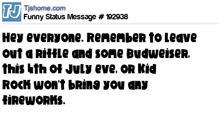 X is Hey everyone. Remember to leave out a riffle and some Budweiser, this 4th of July eve, or Kid Rock won't bring you any fireworks.