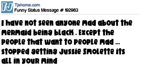 X says I have not seen anyone mad about the mermaid being black . Except the people that want to people mad ... stopped getting Jussie Smolette its all in your mind