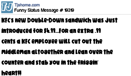 X says KFC's new Double-Down sandwich was just introduced for $4.99...For an extra .99 cents a KFC employee will cut out the middleman altogether and lean over the counter and stab you in the friggin' heart!!