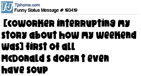 X says [coworker interrupting my story about how my weekend was] first of all McDonald’s doesn’t even have soup