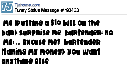 - # 197199 bartender just now: the usual? me: you know it bartender: [throws me thru window]