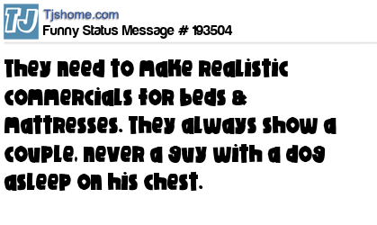 X says They need to make realistic commercials for beds & mattresses. They always show a couple, never a guy with a dog asleep on his chest.