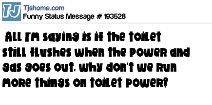 - # 194140 All I'm saying is if the toilet still flushes when the power and gas goes out, why don't we run more things on toilet power?