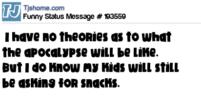 X says  I have no theories as to what the apocalypse will be like.  But I do know my kids will still be asking for snacks.