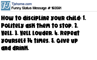 X says How to discipline your child: 1. Politely ask them to stop. 2. Yell. 3. Yell louder. 4. Repeat yourself 74 times. 5. Give up and drink.