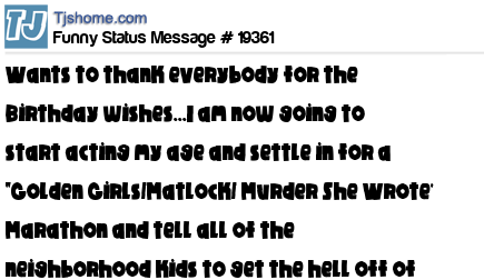 X Wants to thank everybody for the Birthday wishes...I am now going to start acting my age and settle in for a "Golden Girls/Matlock/ Murder She Wrote' Marathon and tell all of the neighborhood kids to get the hell off of my lawn!