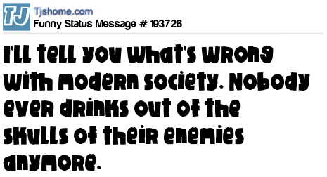 - # 189296 The problem with society today is that no one drinks out of the skuls of their enemies anymore.