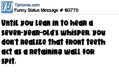 X says Until you lean in to hear a seven-year-old's whisper, you don't realize that front teeth act as a retaining wall for spit.