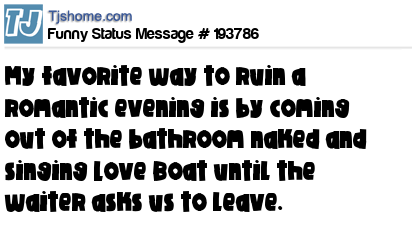 X says My favorite way to ruin a romantic evening is by coming out of the bathroom naked and singing Love Boat until the waiter asks us to leave.