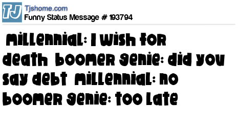 X says millennial: I wish for death boomer genie: did you say debt millennial: no boomer genie: too late
