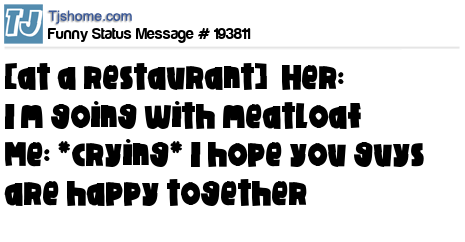 X says [at a restaurant] Her: I’m going with meatloaf Me: *crying* I hope you guys are happy together
