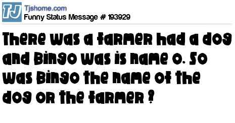 - # 208543 My eight-year-old just asked me if Bingo was the name of the farmer or the dog. Now I am questioning everything I thought I knew about life.