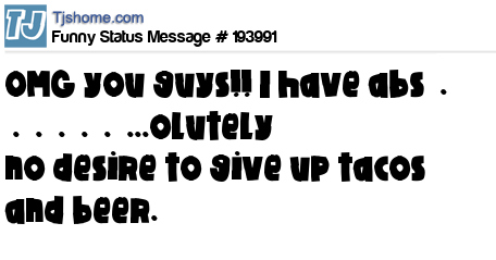 X says OMG you guys!! I have abs . . . . . . ...olutely no desire to give up tacos and beer.