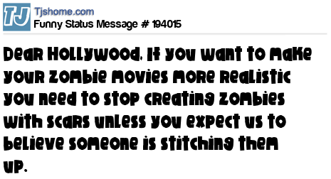 X is Dear Hollywood, If you want to make your zombie movies more realistic you need to stop creating zombies with scars unless you expect us to believe someone is stitching them up.