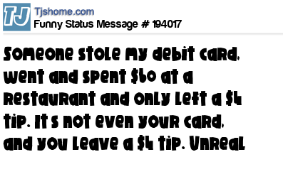 X says Someone stole my debit card, went and spent $60 at a restaurant and only left a $4 tip. It’s not even your card, and you leave a $4 tip. Unreal