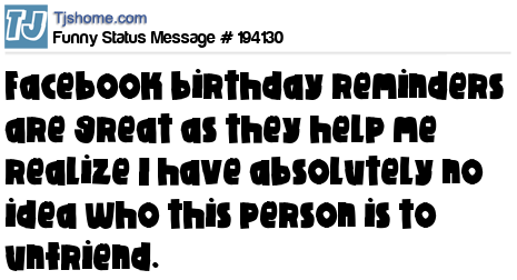 - # 192747 Thanks to Facebook birthday reminders I know who to unfriend after thinking who the heck is this person?