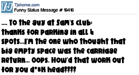 X .... To the guy at Sam's club: thanks for parking in all 4 spots...I'm the one who thought that big empty space was the carriage return... Oops. How'd that work out for you d*#k head????