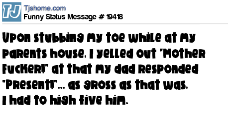 X Upon stubbing my toe while at my parents house, I yelled out "Mother Fucker!" at that my dad responded "Present!"... as gross as that was, I had to high five him.