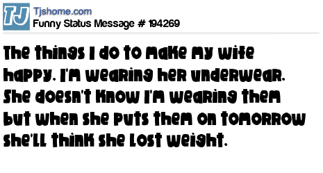 X The things I do to make my wife happy. I'm wearing her underwear. She doesn't know I'm wearing them but when she puts them on tomorrow she'll think she lost weight.