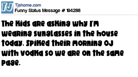 X says The kids are asking why I'm wearing sunglasses in the house today. Spiked their morning OJ with vodka so we are on the same page.