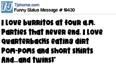 - # 7535 I love quarterbacks eating dirt, Pom-poms and short skirts, Fans who won't quit and twins. I love burritos at four a.m. Parties that never end, Dogs that love cats and...And Twins!"