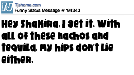X says Hey Shakira, I get it. With all of these nachos and tequila, my hips don't lie either.