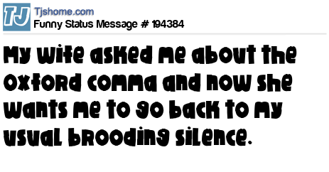 X says My wife asked me about the Oxford comma and now she wants me to go back to my usual brooding silence.