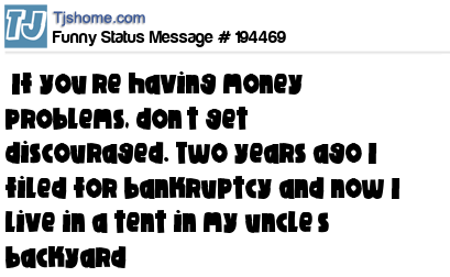 X says If you’re having money problems, don’t get discouraged. Two years ago I filed for bankruptcy and now I live in a tent in my uncle’s backyard