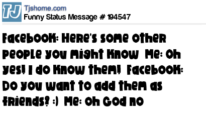 X says Facebook: Here's some other people you might know  Me: Oh yes! I do know them!  Facebook: Do you want to add them as friends? :)  Me: oh God no