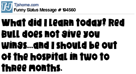 X says What did I learn today? Red Bull does not give you wings...and I should be out of the hospital in two to three months.