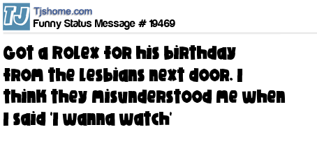 - # 174601 The lesbians next door gave my a Rolex for my birthday. I think they misunderstood when I said "I wanna watch."