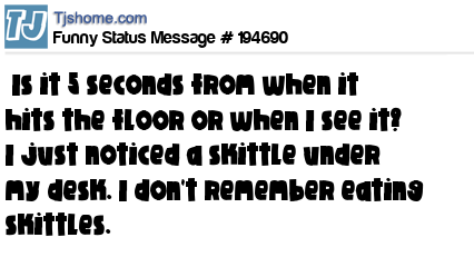 X says Is it 5 seconds from when it hits the floor or when I see it? I just noticed a skittle under my desk. I don't remember eating skittles.