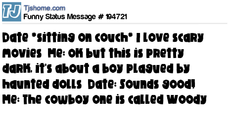 X says Date *sitting on couch* I love scary movies Me: ok but this is pretty dark, it's about a boy plagued by haunted dolls Date: Sounds good! Me: The cowboy one is called Woody