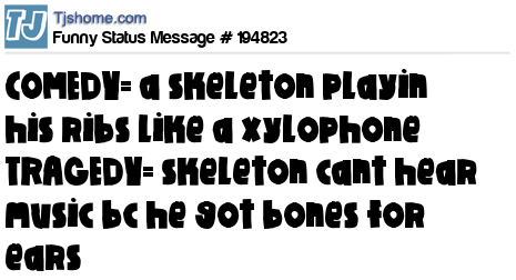 X says COMEDY= a skeleton playin his ribs like a xylophone TRAGEDY= skeleton cant hear music bc he got bones for ears
