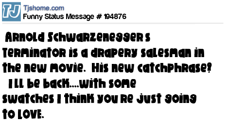 X says  Arnold Schwarzenegger’s Terminator is a drapery salesman in the new movie.  His new catchphrase?  “I’ll be back....with some swatches I think you’re just going to LOVE.”