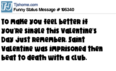 - # 196584 If you're alone and sad for Valentine's Day, to make you feel better just remember that for the love of a woman Saint Valentine was imprisoned then beat to death with clubs :-)
