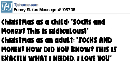 X says Christmas as a child: "Socks and Money? This is ridiculous!" Christmas as an adult: "SOCKS AND MONEY? HOW DID YOU KNOW? THIS IS EXACTLY WHAT I NEEDED. I LOVE YOU"