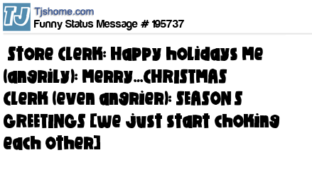 X says Store Clerk: Happy holidays Me (angrily): Merry…CHRISTMAS Clerk (even angrier): SEASON’S GREETINGS [we just start choking each other]