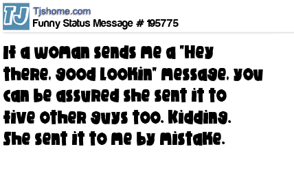 X says If a woman sends me a "Hey there, good lookin" message, you can be assured she sent it to five other guys too. Kidding. She sent it to me by mistake.