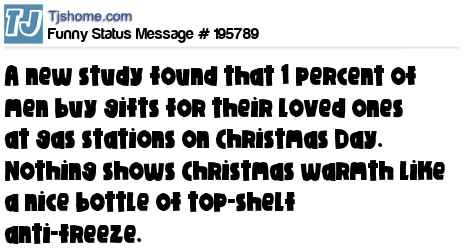 X says A new study found that 1 percent of men buy gifts for their loved ones at gas stations on Christmas Day. Nothing shows Christmas warmth like a nice bottle of top-shelf anti-freeze.