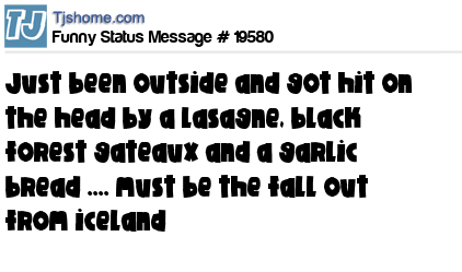 X is just been outside and got hit on the head by a lasagne, black forest gateaux and a garlic bread .... must be the fall out from iceland