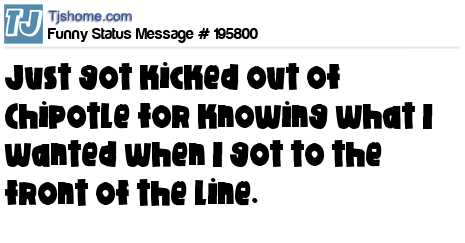 X says Just got kicked out of Chipotle for knowing what I wanted when I got to the front of the line.