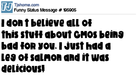 - # 182315 I don't believe the BS about GMO'S being bad for you ! I just had a leg of Salmon and it was delicious .