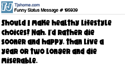 X says Should I make healthy lifestyle choices? Nah. I'd rather die sooner and happy, than live a year or two longer and die miserable.
