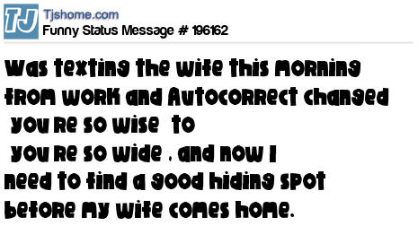 X says Was texting the wife this morning from work and Autocorrect changed “you’re so wise” to “you’re so wide”, and now I need to find a good hiding spot before my wife comes home.
