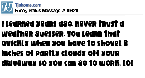 X says I learned years ago, never trust a weather guesser. You learn that quickly when you have to shovel 8 inches of partly cloudy off your driveway so you can go to work. LOL