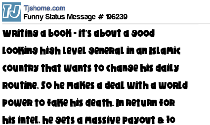 X says Writing a book - it's about a good looking high level general in an Islamic country that wants to change his daily routine. So he makes a deal with a world power to fake his death. In return for his intel, he gets a massive payout & 70 hookers in Miami!